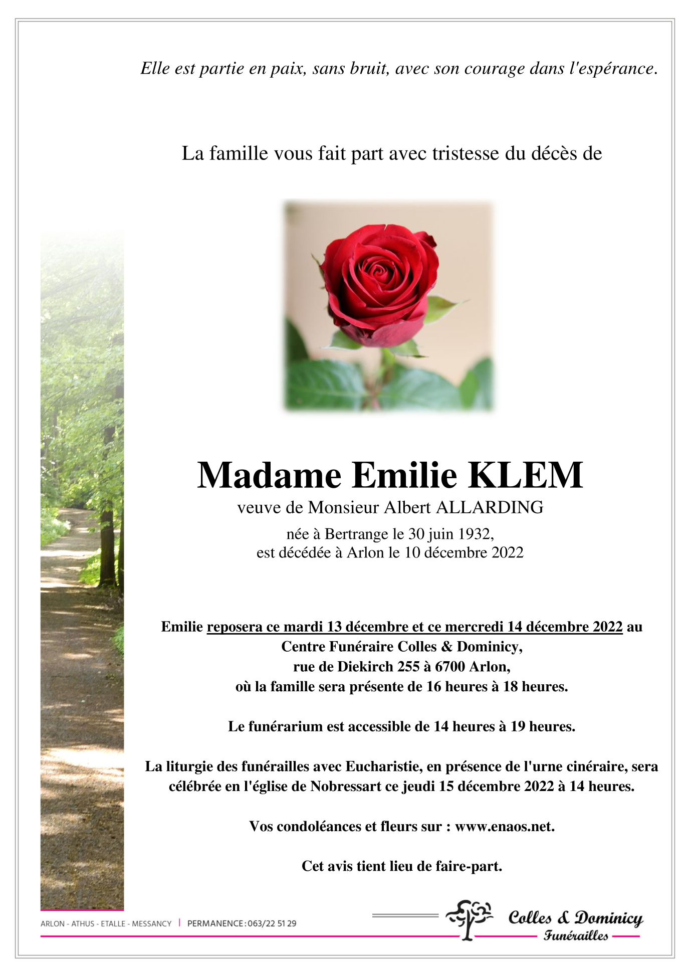 Décédée à Arlon (6700) le samedi 10 décembre 2022 à l'âge de 90 ans