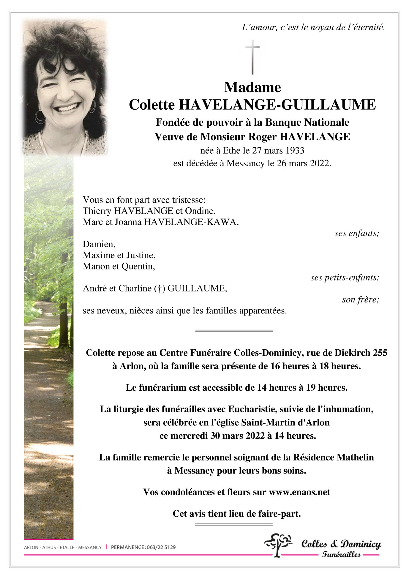 Décédée à Messancy (6780) le samedi 26 mars 2022 à l'âge de 88 ans