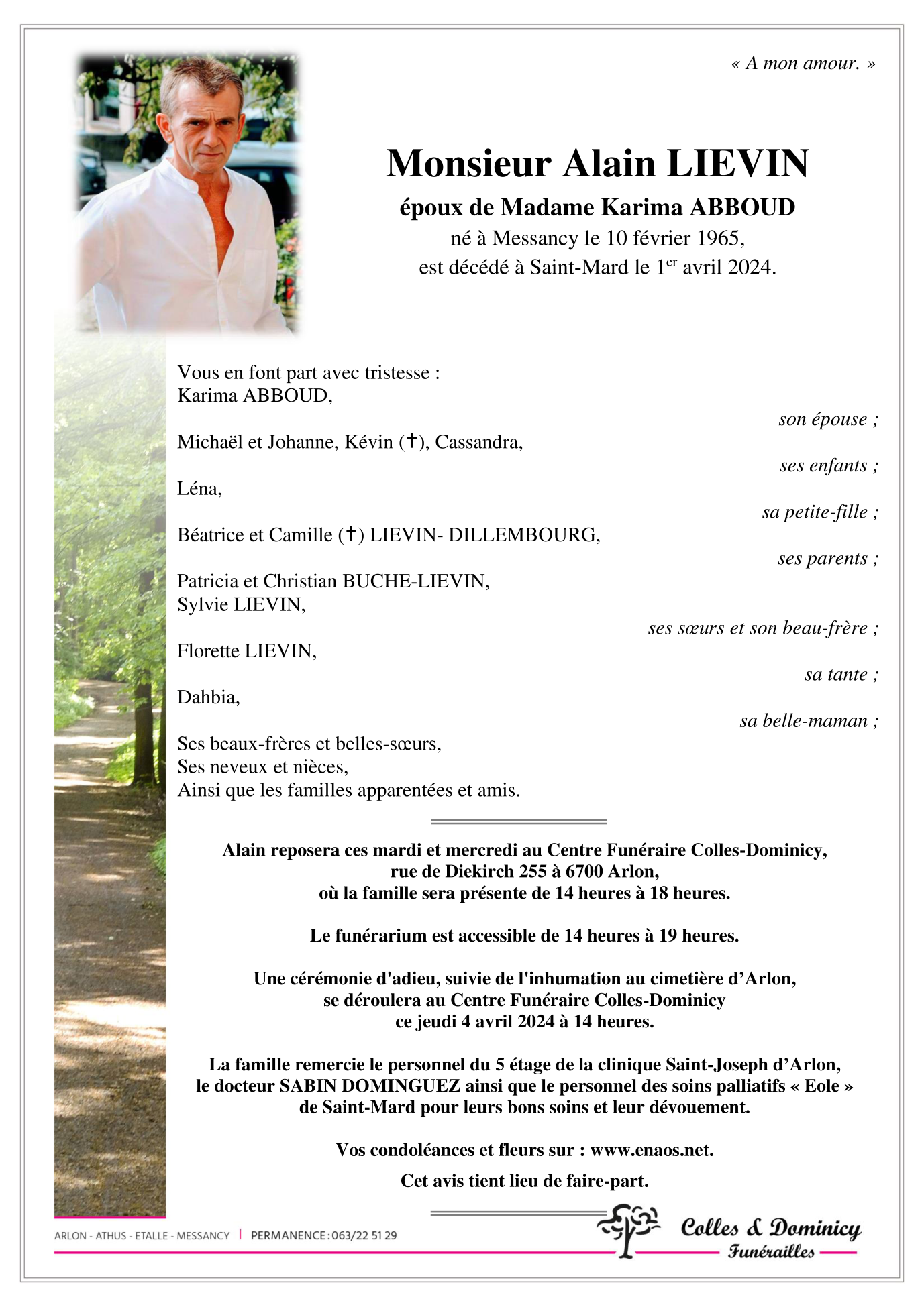 Décédé à Saint-Mard (6762) le lundi 1 avril 2024 à l'âge de 59 ans