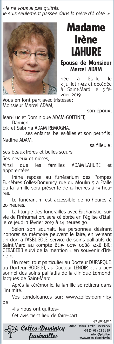 Décédée à Virton (6760) le mardi 5 février 2019 à l'âge de 76 ans