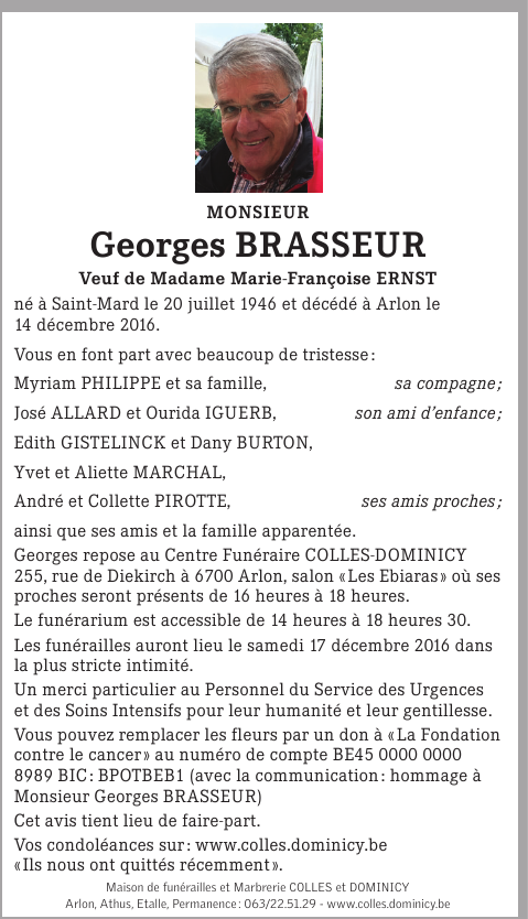 Décédé à Arlon (6700) le mercredi 14 décembre 2016 à l'âge de 70 ans