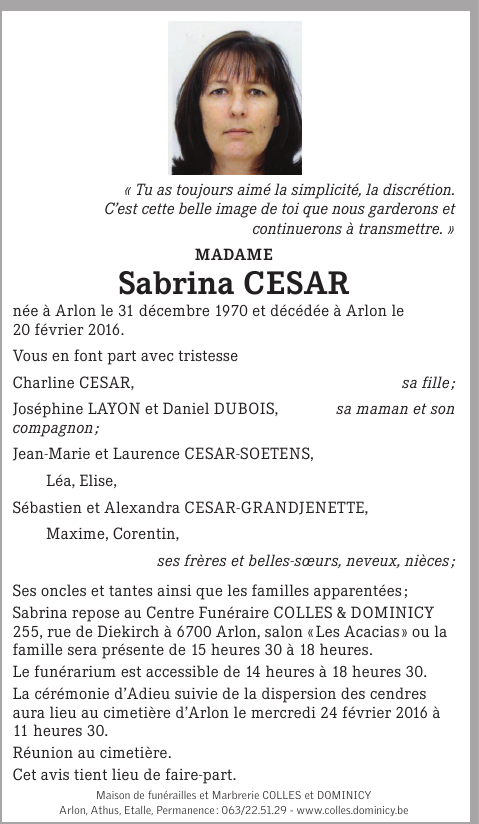 Décédée à Arlon (6700) le samedi 20 février 2016 à l'âge de 45 ans