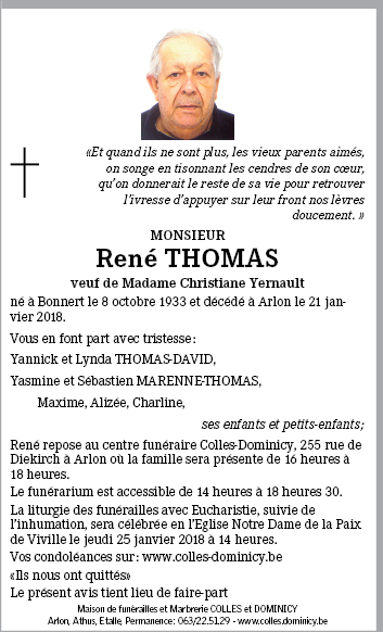 Décédé à Arlon (6700) le dimanche 21 janvier 2018 à l'âge de 84 ans