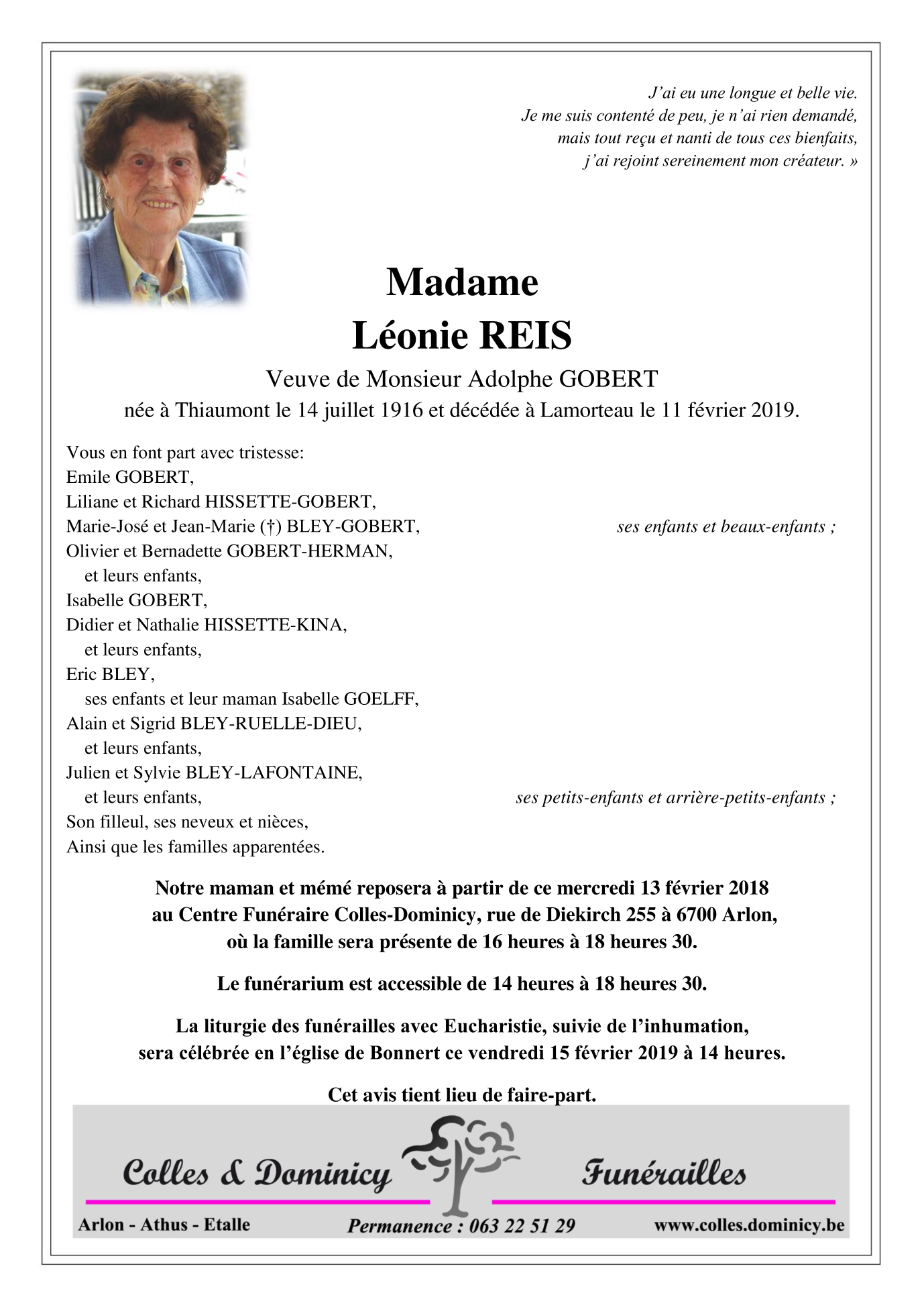 Décédée à Lamorteau (6767) le lundi 11 février 2019 à l'âge de 102 ans