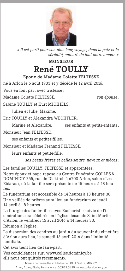 Décédé à Arlon (6700) le mardi 12 avril 2016 à l'âge de 82 ans