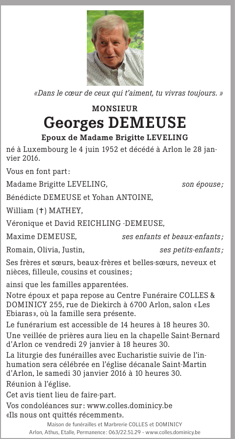 Décédé à Arlon (6700) le jeudi 28 janvier 2016 à l'âge de 63 ans