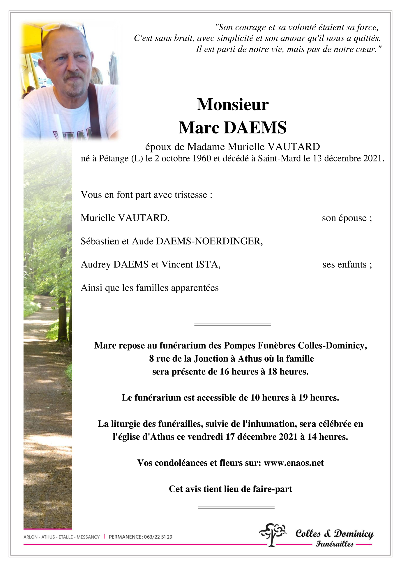 Décédé à Saint-Mard (6762) le lundi 13 décembre 2021 à l'âge de 61 ans
