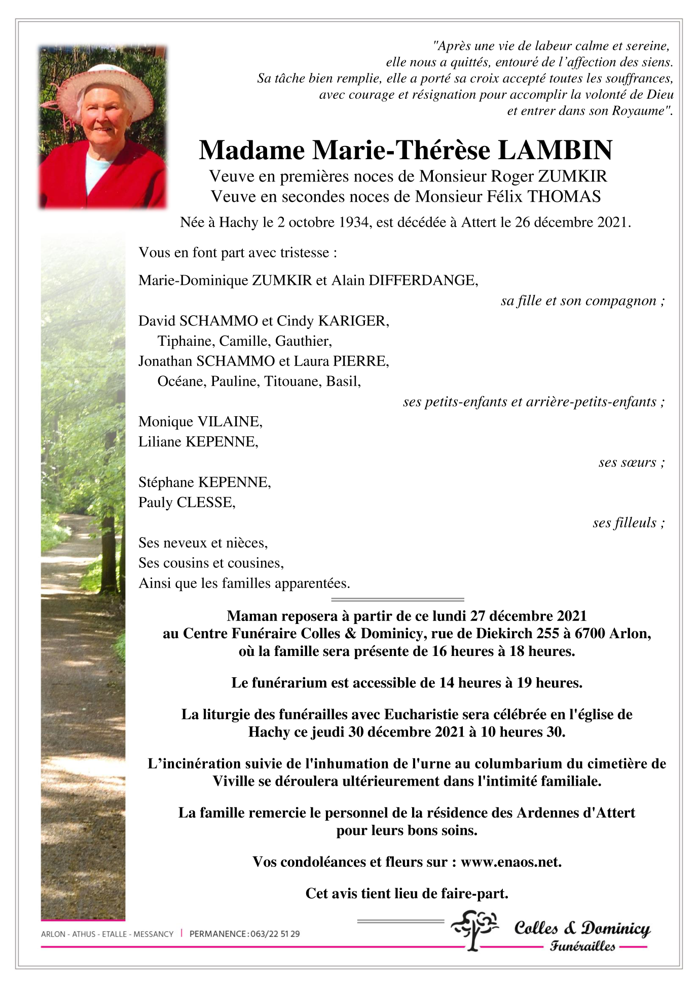 Décédée à Attert (6717) le dimanche 26 décembre 2021 à l'âge de 87 ans