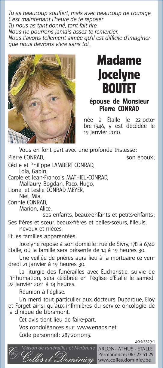 Décédée à Etalle (6740) le mercredi 19 janvier 2011 à l'âge de 64 ans