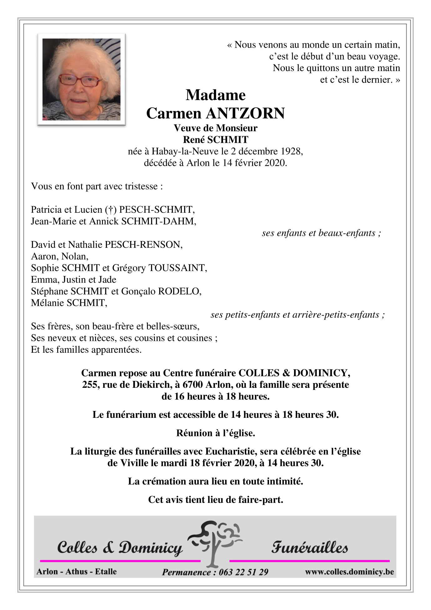 Décédée à Arlon (6700) le vendredi 14 février 2020 à l'âge de 91 ans