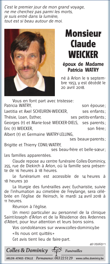 Décédé à Arlon (6700) le vendredi 20 avril 2018 à l'âge de 64 ans