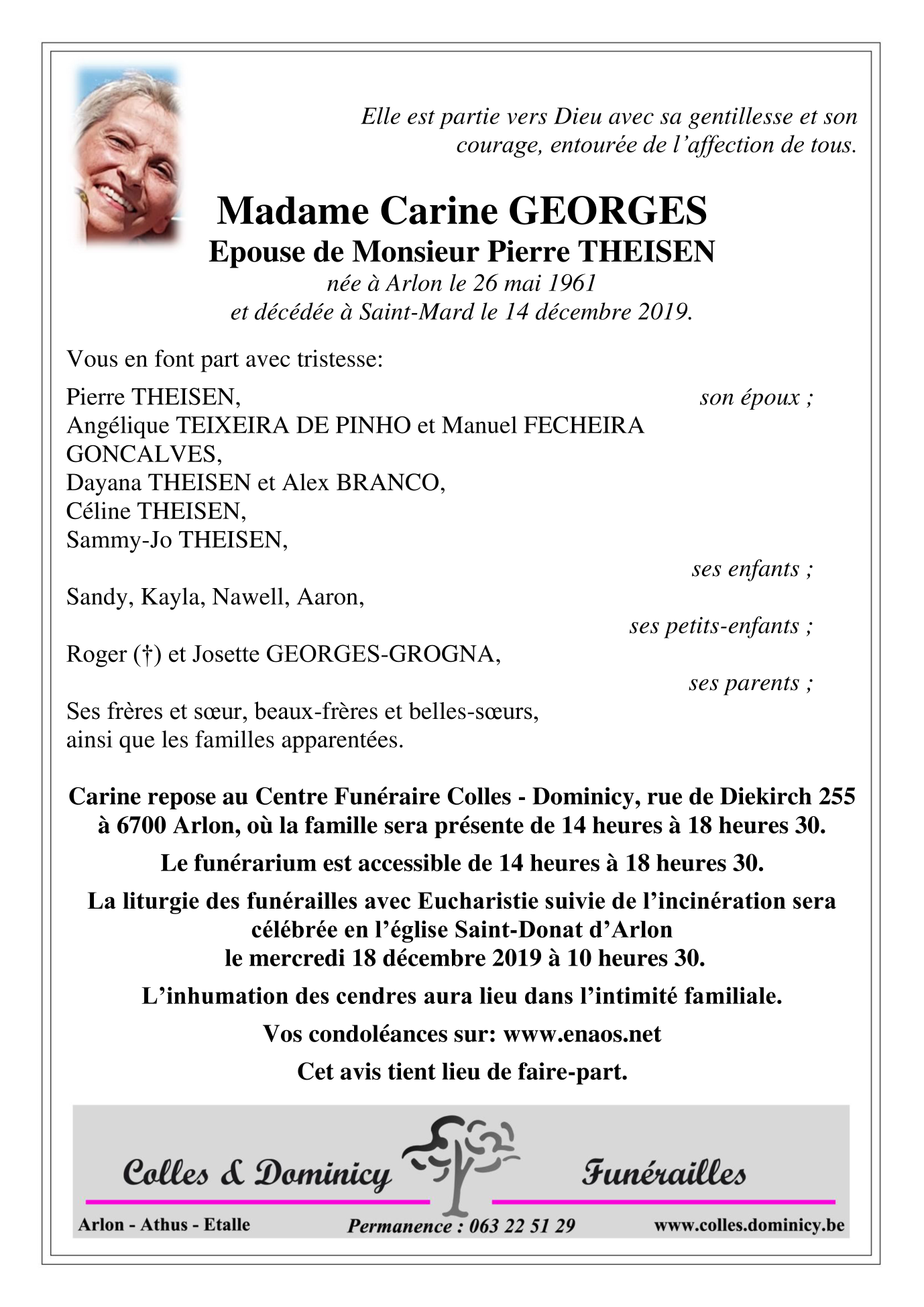Décédée à Saint-Mard (6762) le samedi 14 décembre 2019 à l'âge de 58 ans