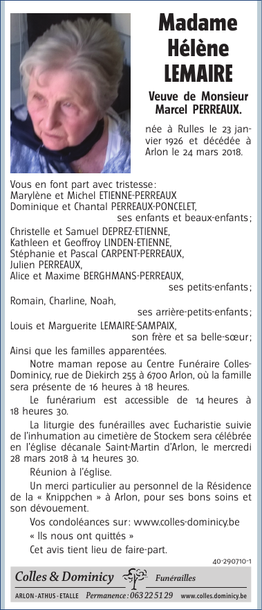 Décédée à Arlon (6700) le samedi 24 mars 2018 à l'âge de 92 ans
