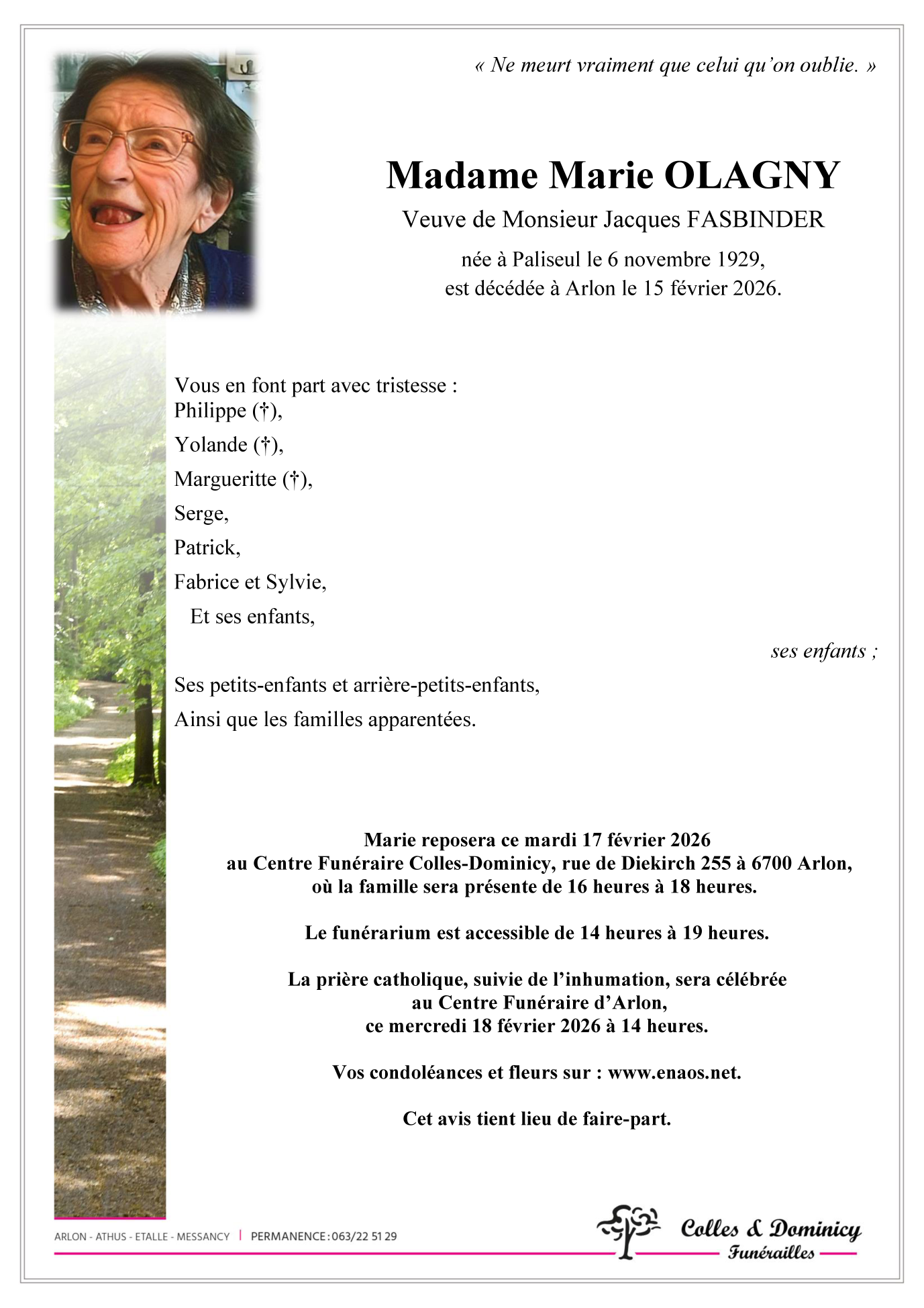 Décédée à Arlon (6700) le dimanche 15 février 2026 à l'âge de 96 ans