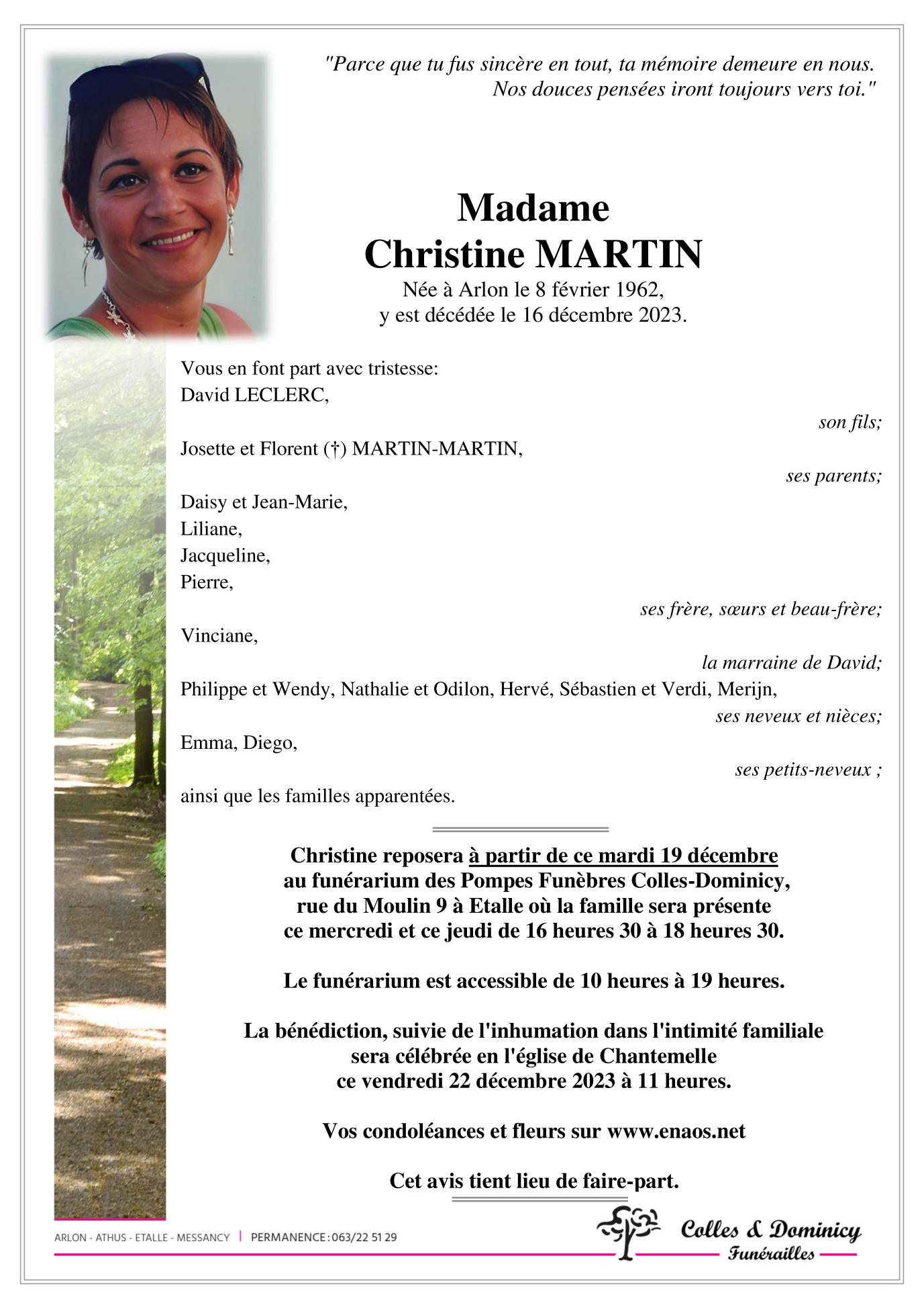 Décédée à Arlon (6700) le samedi 16 décembre 2023 à l'âge de 61 ans