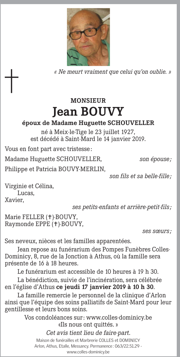 Décédé à Saint-Mard (6762) le lundi 14 janvier 2019 à l'âge de 91 ans
