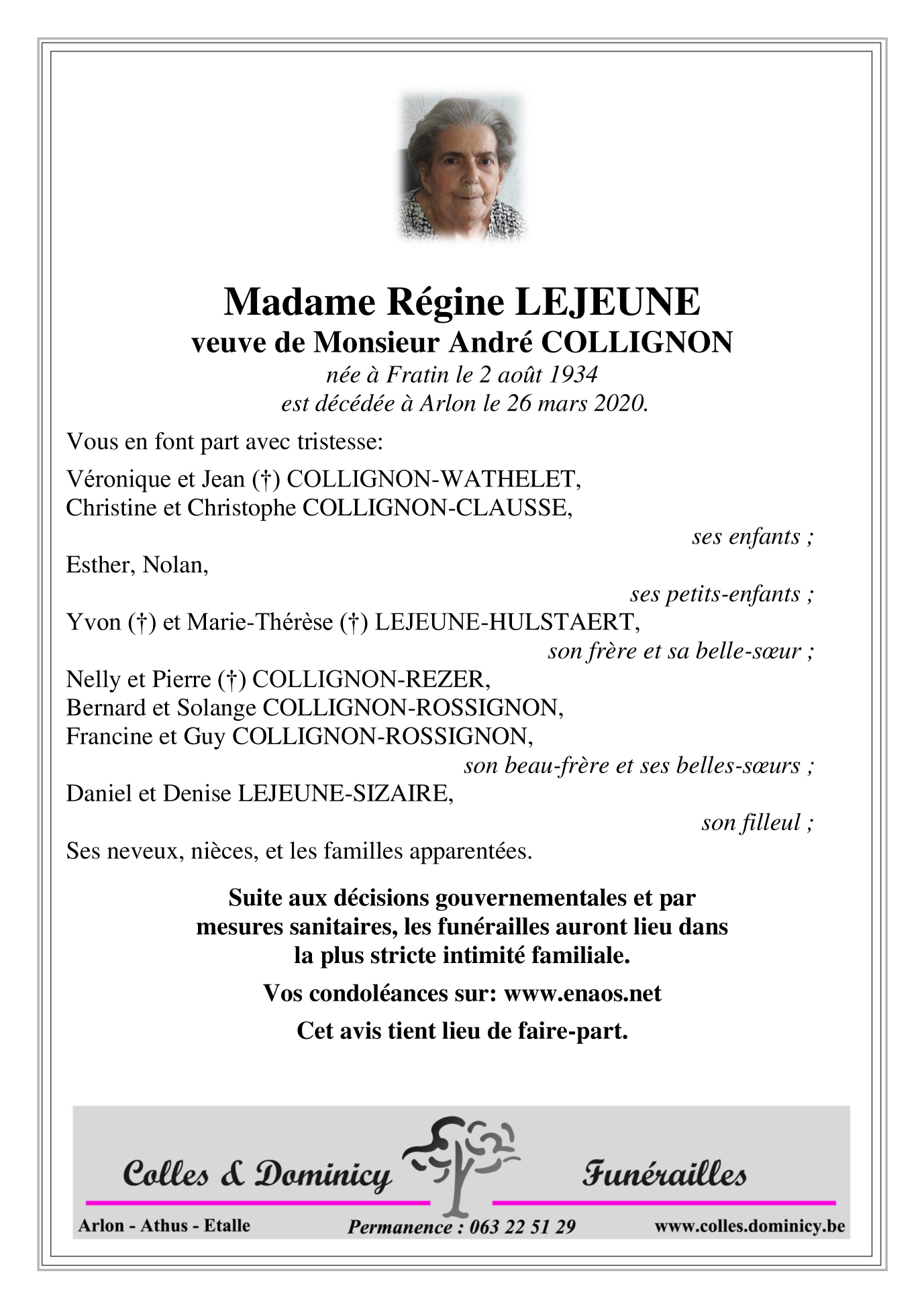 Décédée à Arlon (6700) le jeudi 26 mars 2020 à l'âge de 85 ans