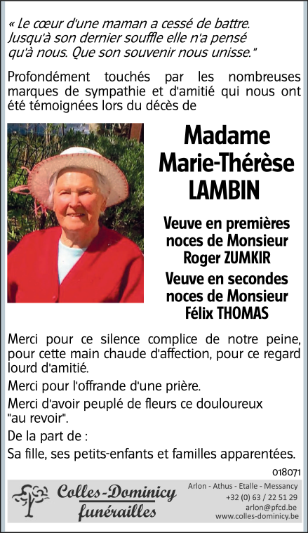 Décédée à Attert (6717) le dimanche 26 décembre 2021 à l'âge de 87 ans