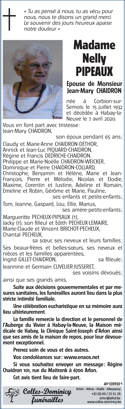 Décédée à Habay (6720) le mardi 7 avril 2020 à l'âge de 87 ans
