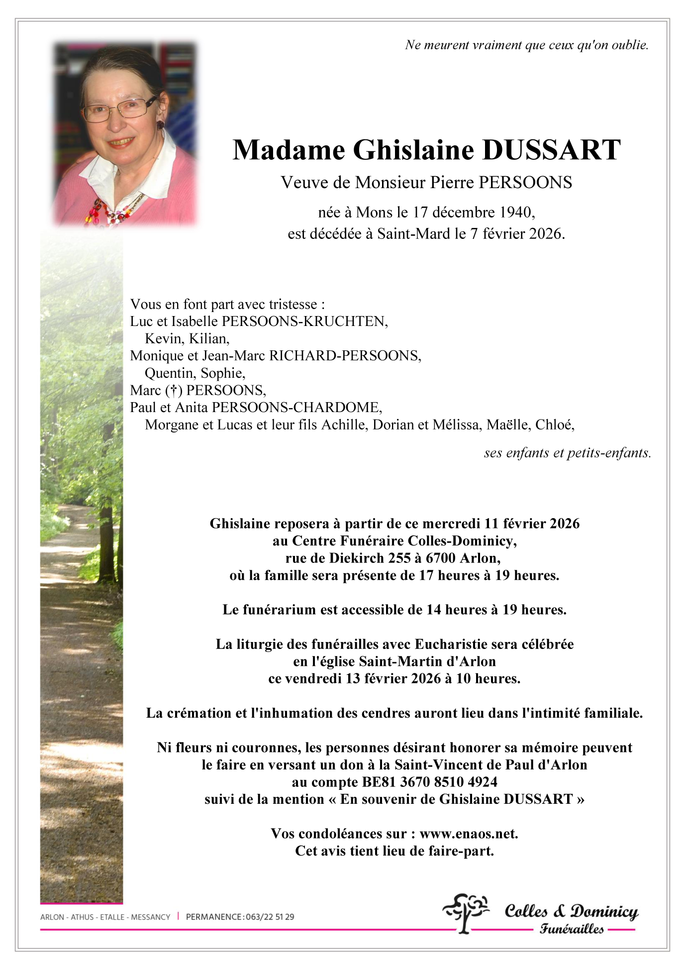 Décédée à Saint-Mard (6762) le samedi 7 février 2026 à l'âge de 85 ans