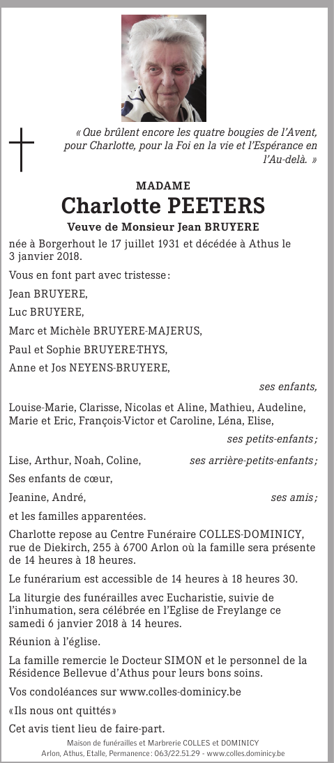 Décédée à Athus (6791) le mercredi 3 janvier 2018 à l'âge de 86 ans