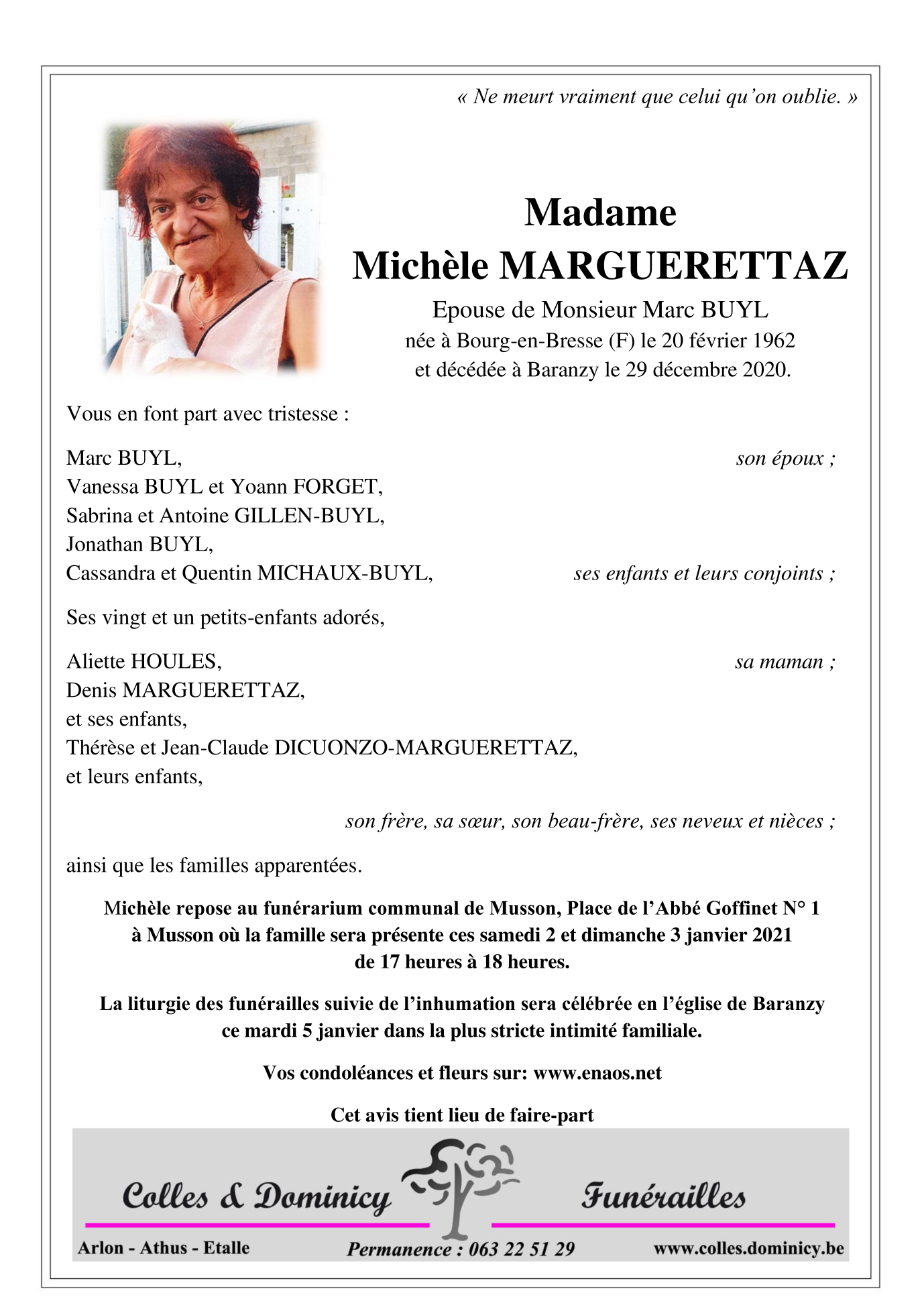 Décédée à Baranzy (6750) le mardi 29 décembre 2020 à l'âge de 58 ans
