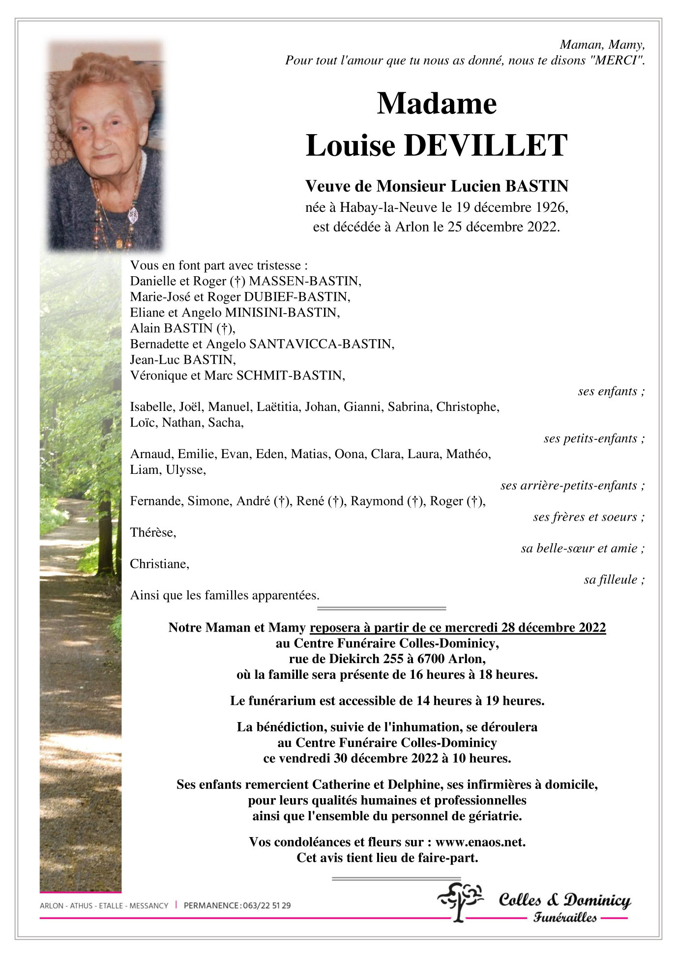 Décédée à Arlon (6700) le dimanche 25 décembre 2022 à l'âge de 96 ans