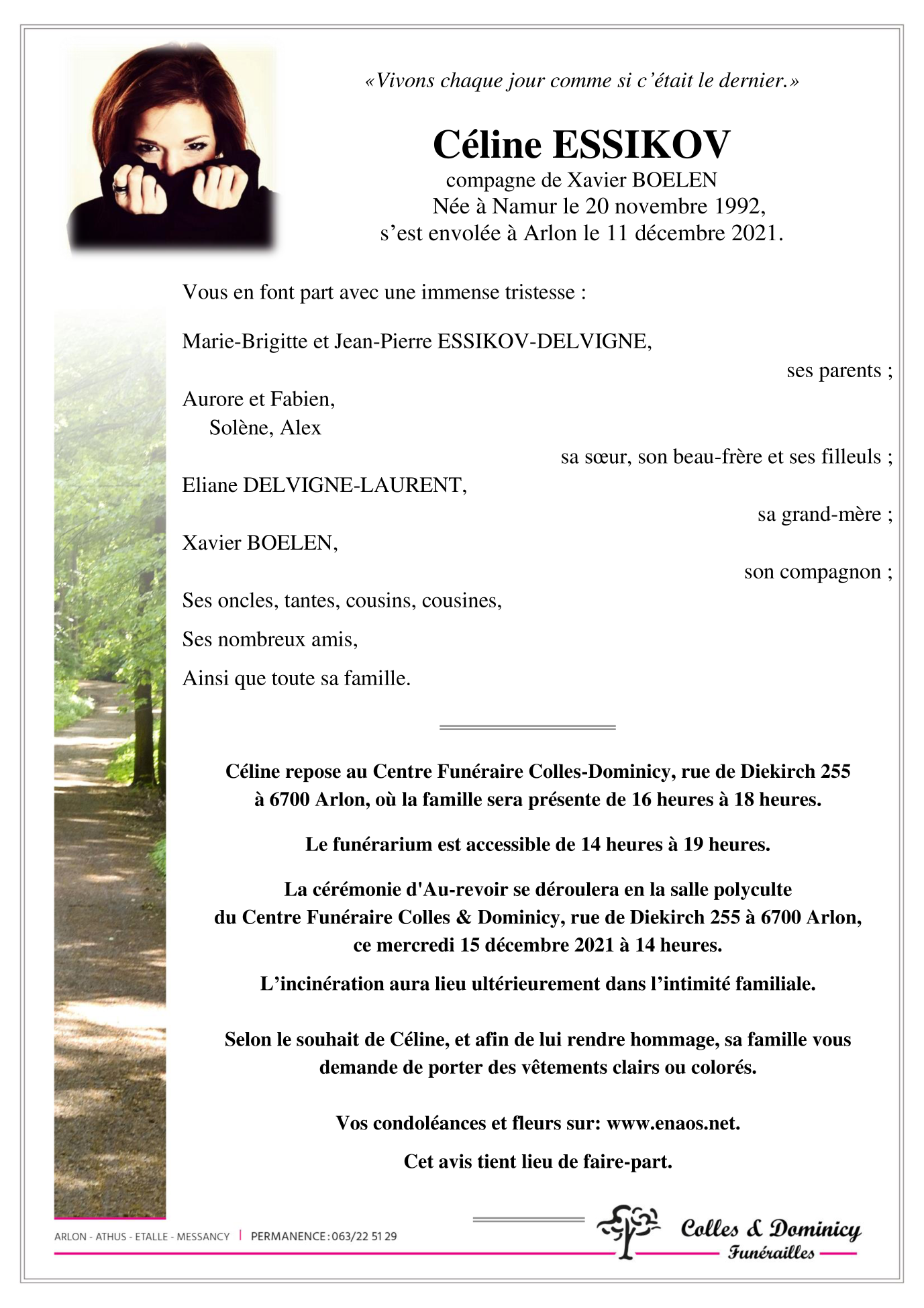 Décédée à Arlon (6700) le samedi 11 décembre 2021 à l'âge de 29 ans