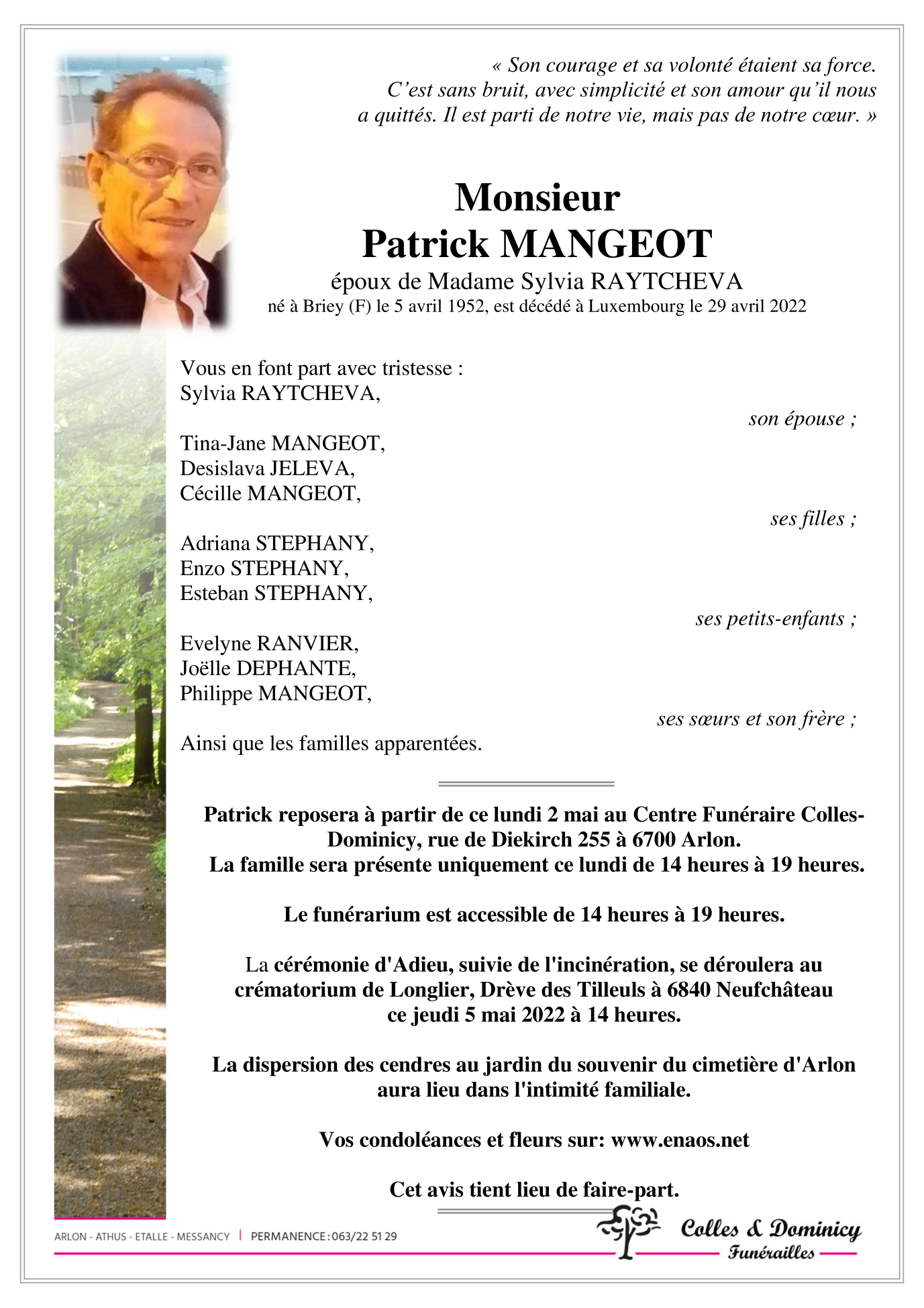 Décédé à Luxembourg/Anvers  (1130, Luxembourg) le vendredi 29 avril 2022 à l'âge de 70 ans