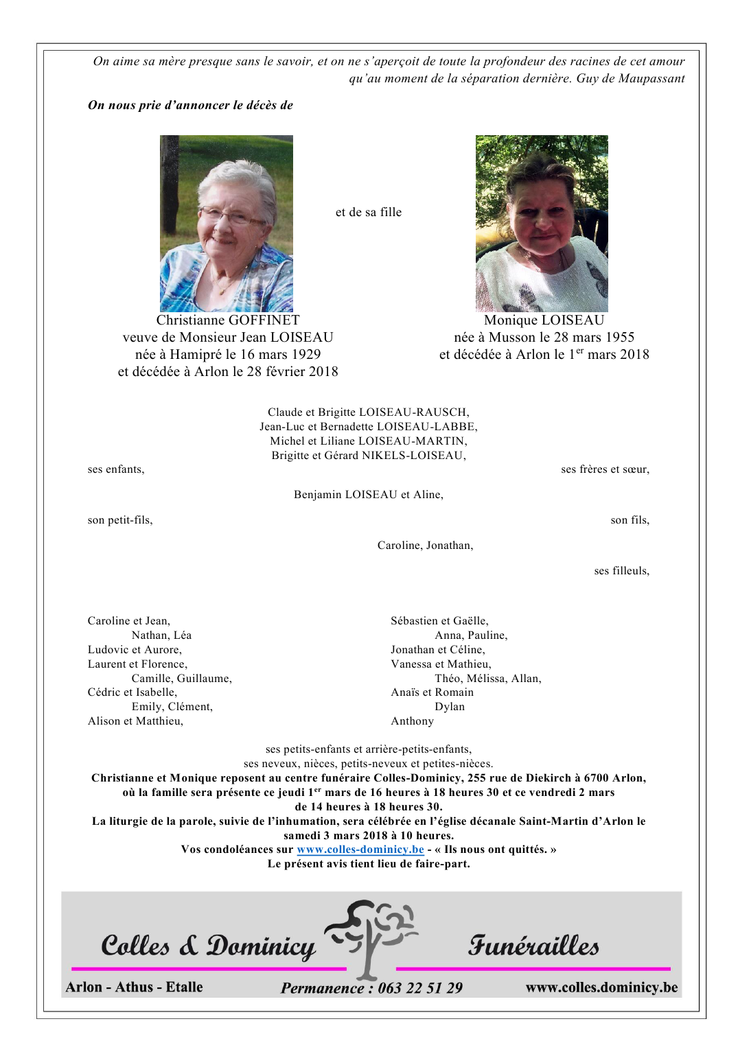 Décédée à Arlon (6700) le jeudi 1 mars 2018 à l'âge de 62 ans
