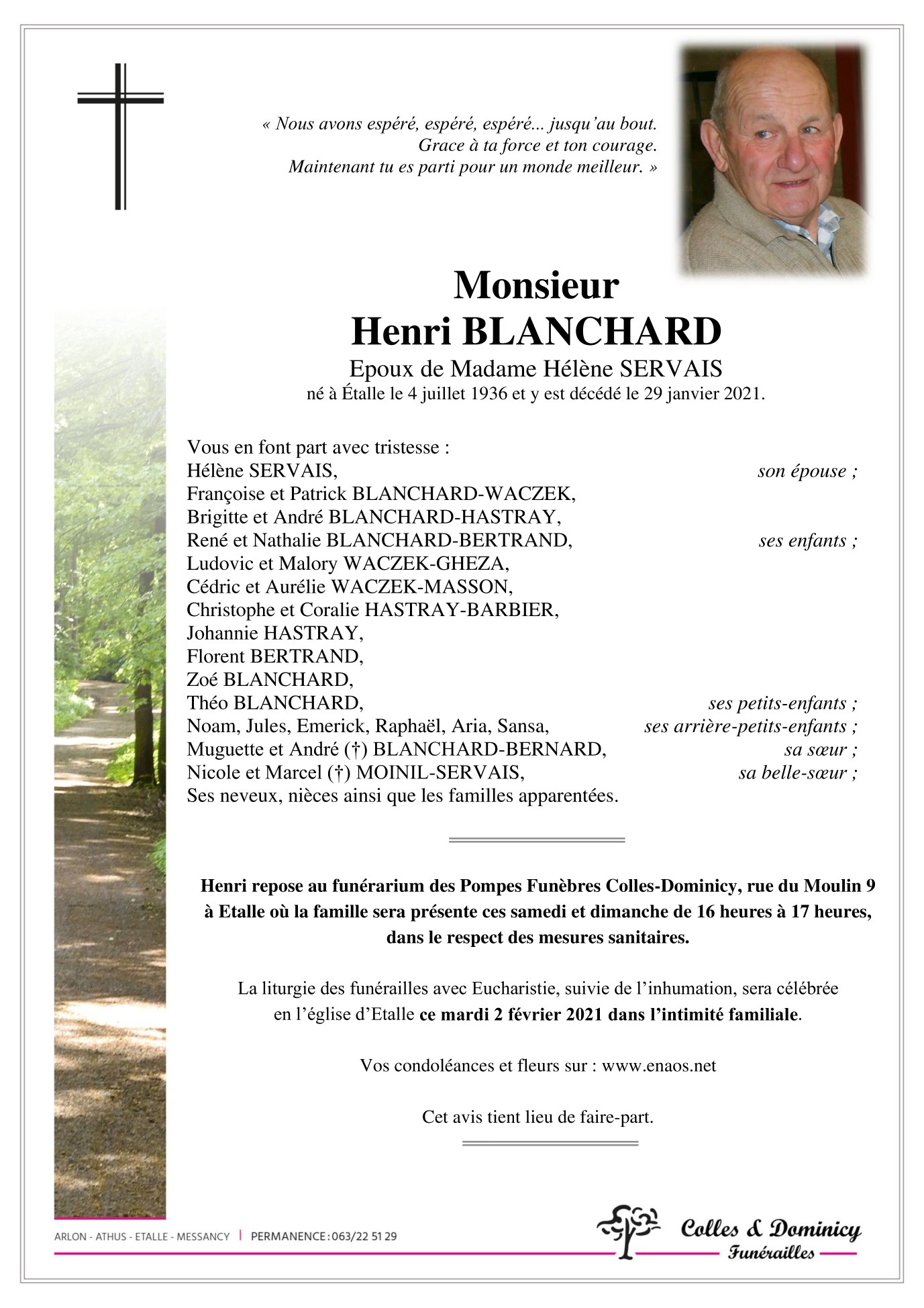 Décédé à Etalle (6740) le vendredi 29 janvier 2021 à l'âge de 84 ans
