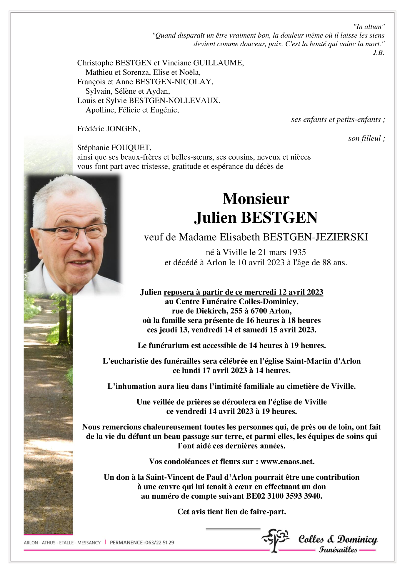Décédé à Arlon (6700) le lundi 10 avril 2023 à l'âge de 88 ans