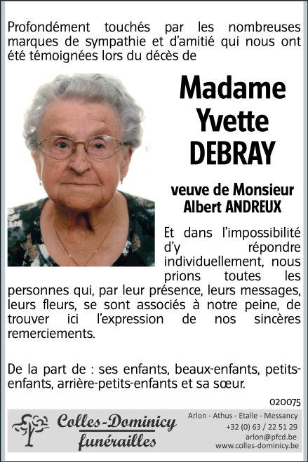 Décédée à Villers-Devant-Orval (6823) le vendredi 31 décembre 2021 à l'âge de 98 ans
