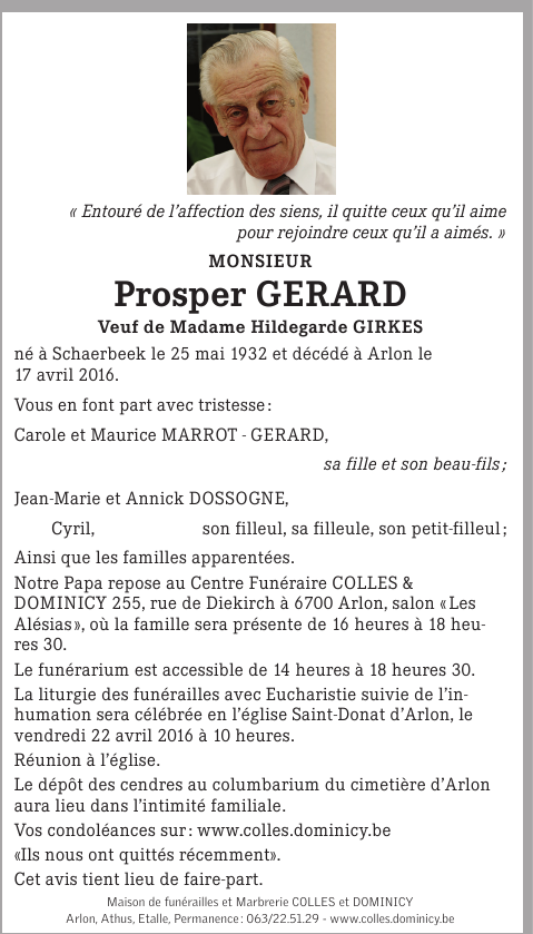 Décédé à Arlon (6700) le dimanche 17 avril 2016 à l'âge de 83 ans