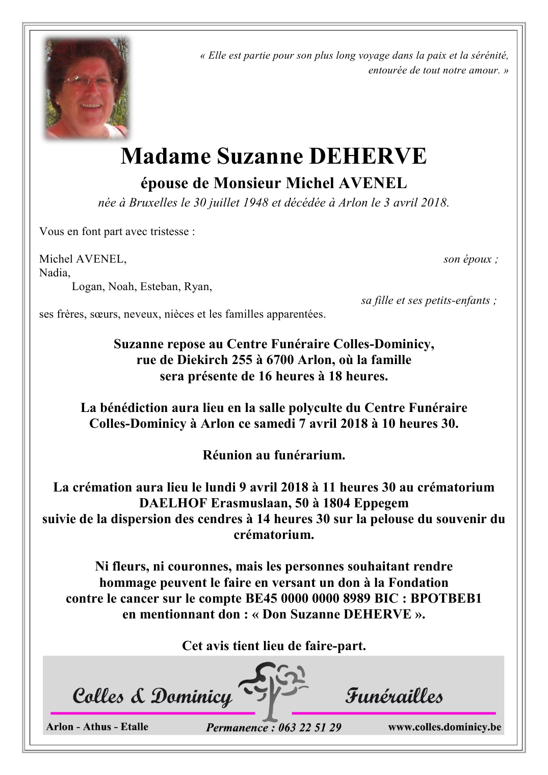 Décédée à Arlon (6700) le mardi 3 avril 2018 à l'âge de 69 ans
