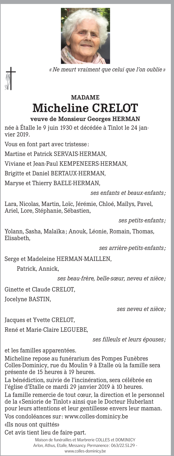 Décédée à Tinlot (4557) le jeudi 24 janvier 2019 à l'âge de 88 ans