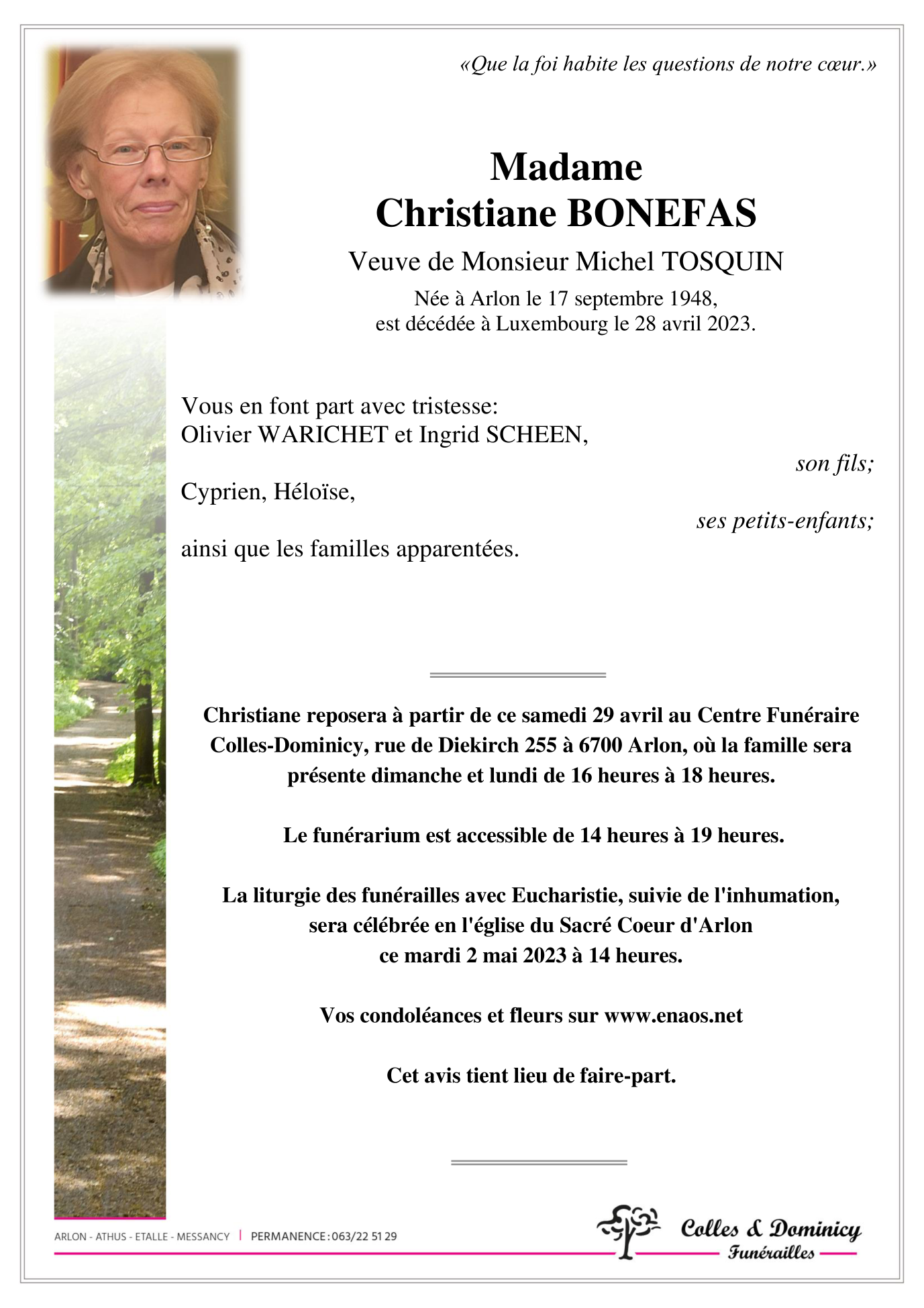 Décédée à Luxembourg/Barble  (1210, Luxembourg) le vendredi 28 avril 2023 à l'âge de 74 ans