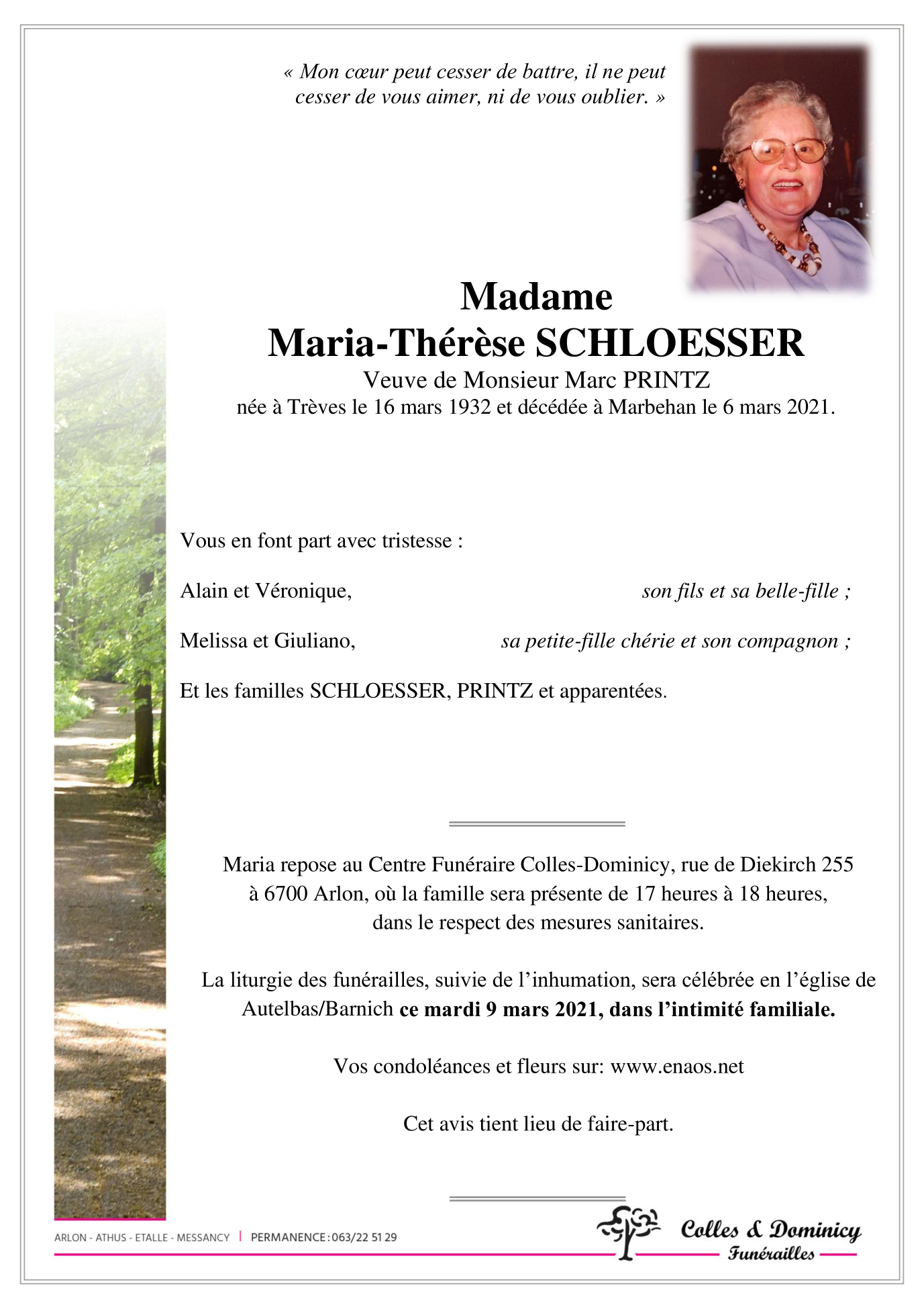 Décédée à Marbehan (6724) le samedi 6 mars 2021 à l'âge de 88 ans