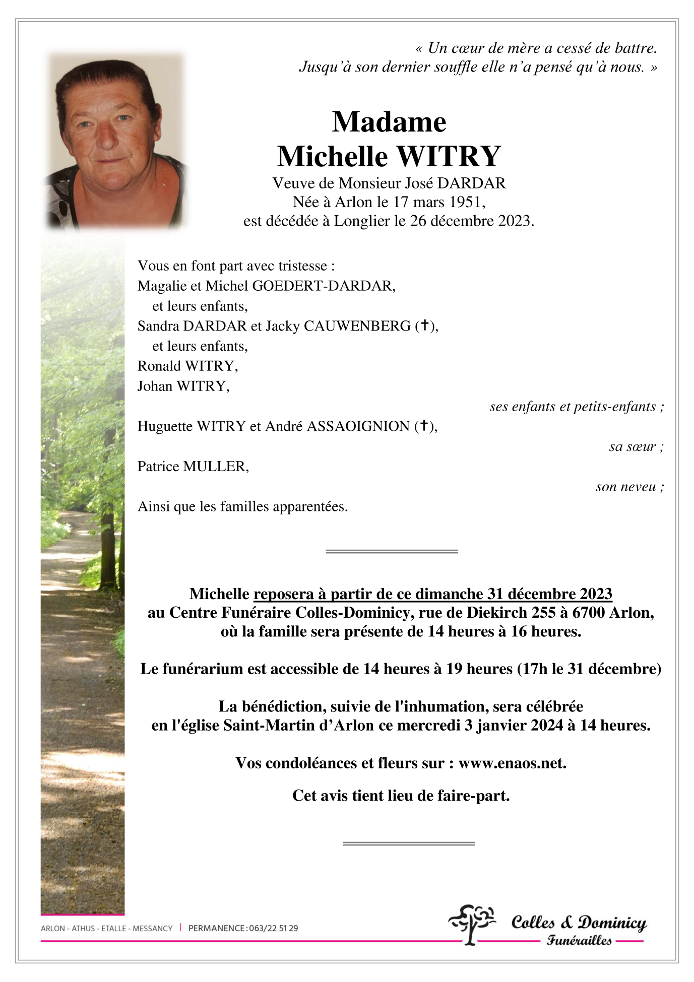 Décédée à Longlier (6840) le mardi 26 décembre 2023 à l'âge de 72 ans