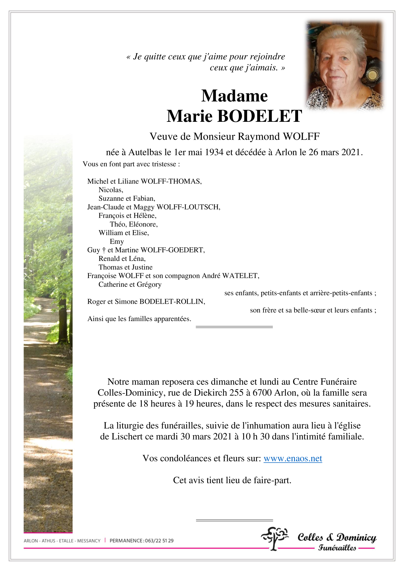 Décédée à Arlon (6700) le vendredi 26 mars 2021 à l'âge de 86 ans