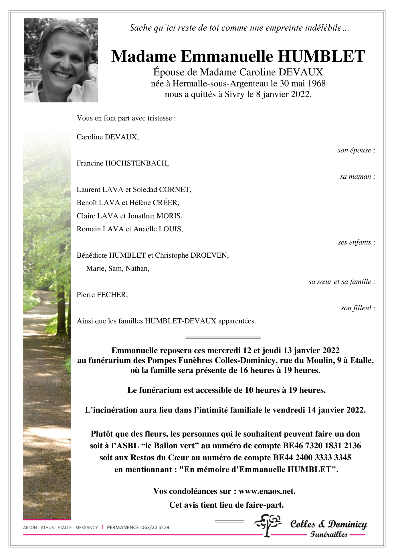 Décédée à Sivry (6740) le samedi 8 janvier 2022 à l'âge de 53 ans