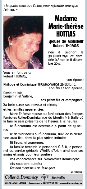 Décédée à Arlon (6700) le vendredi 8 décembre 2017 à l'âge de 79 ans
