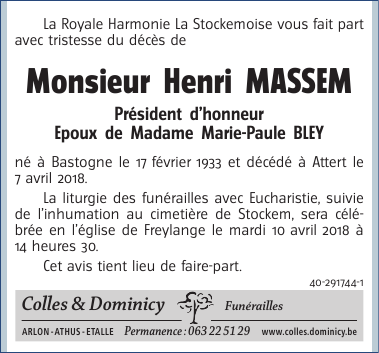 Décédé à Attert (6717) le samedi 7 avril 2018 à l'âge de 85 ans