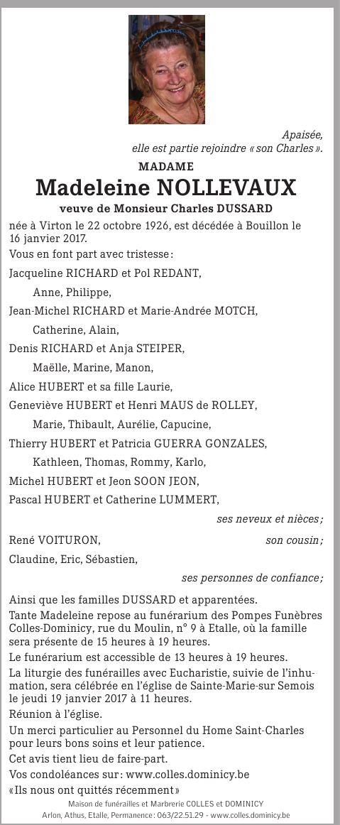 Veuve de Monsieur Charles DUSSARD
