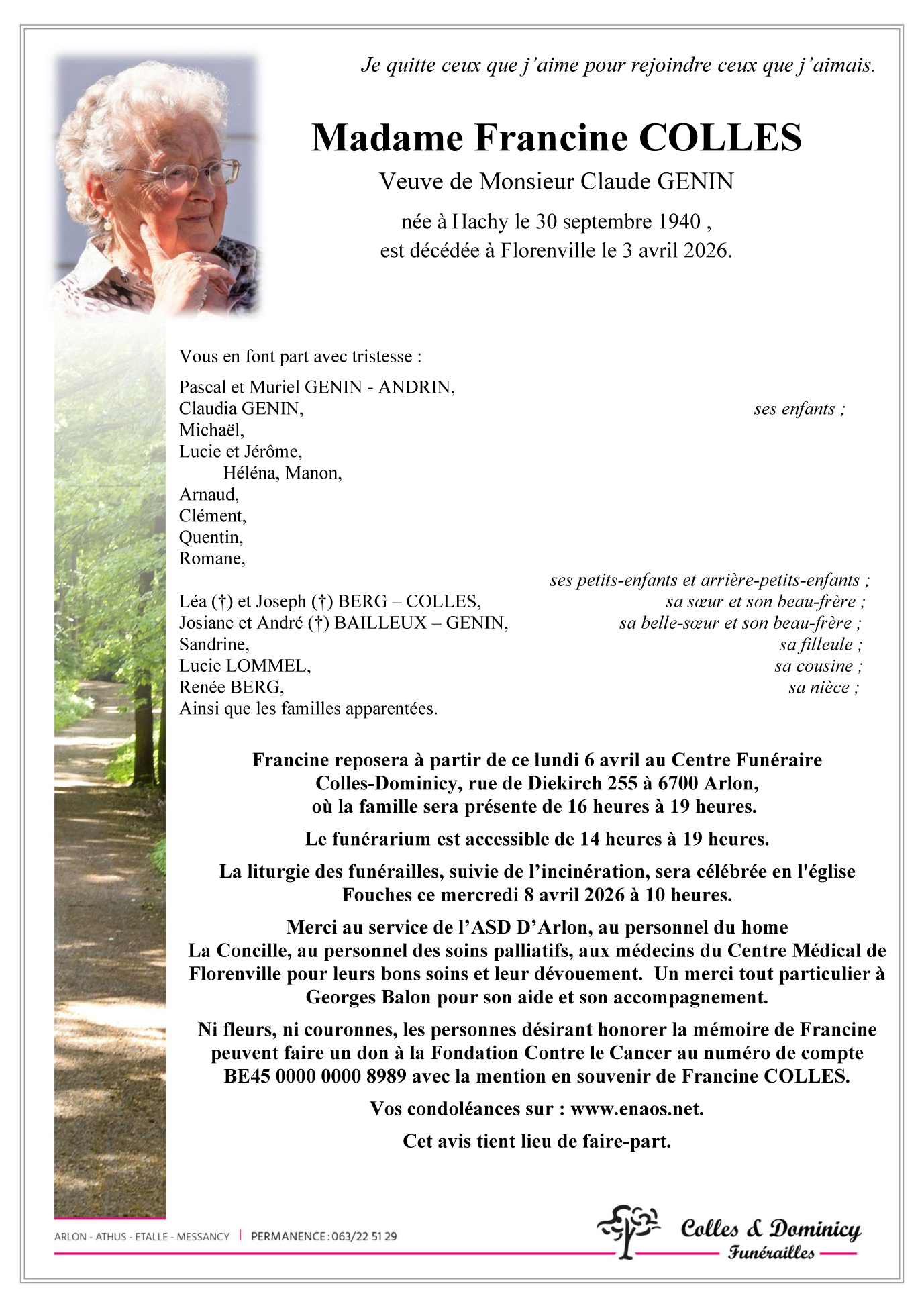 Décédée à Florenville (6820) le vendredi 3 avril 2026 à l'âge de 85 ans