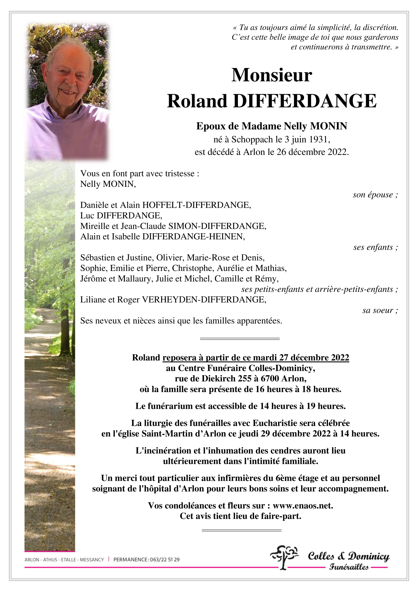 Décédé à Arlon (6700) le lundi 26 décembre 2022 à l'âge de 91 ans