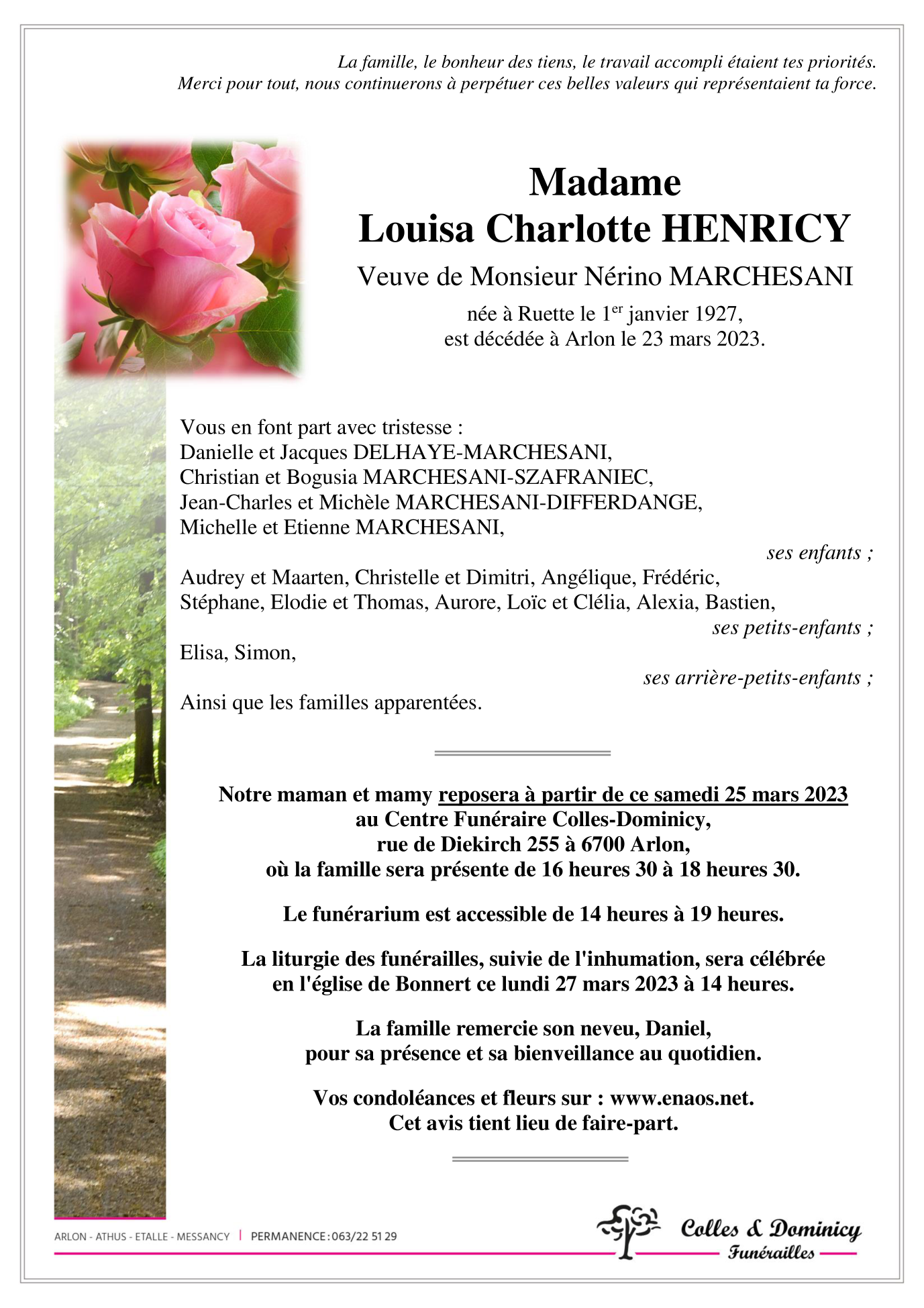 Décédée à Arlon (6700) le jeudi 23 mars 2023 à l'âge de 96 ans