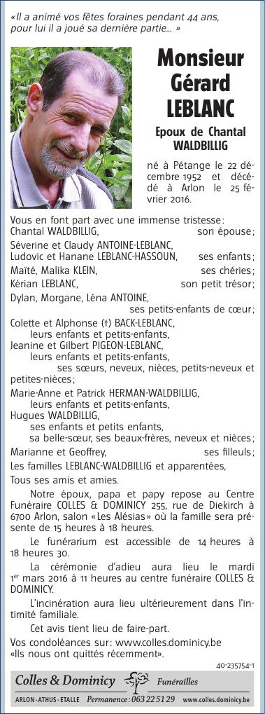 Décédé à Arlon (6700) le jeudi 25 février 2016 à l'âge de 63 ans